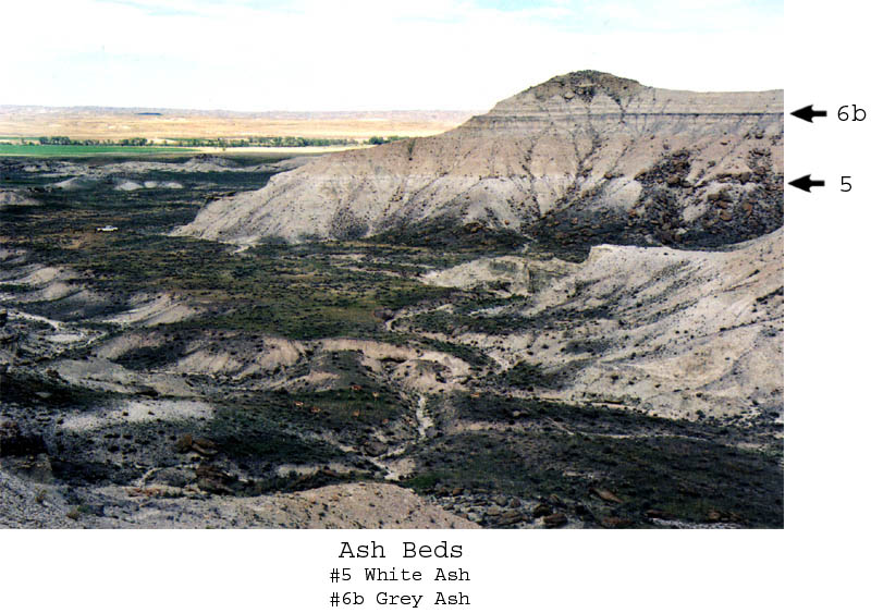 It is a classic paleoenvironment for preserving a terrestrial fauna. The occurrence of more than 13 volcanic tuffs (airfall ash deposits) within the White River Formation interspersed with numerous excellent fossils and magnetically susceptible rocks provides a unique and scientifically exciting control to the geology of this area that is unparalleled. Only two of the tuffs has been isotopically dated (Tuff #5 age 33.9 Ma, Swisher and Prothero, 1990 and Prothero and Swisher, 1992)(Tuff #5 age 34 Ma, Tuff #7 age 31.2 Ma, J. Scott 2000), but many of the other tuffs can and should be dated. The stratigraphy and invertebrate (snail) paleontology of the area has recently been thoroughly studied by Evanoff (1993 and et.al 1992) with many measured sections and descriptions of the volcanic tuffs. A generalized measured section is presented here from Evanoff's PhD dissertation studies( Figure 2). This co-occurrence of fossils, magnetically stable beds, and datable volcanic tuffs will allow future research in this area to be correlated regionally (Nebraska, South Dakota, western U. S.) and worldwide.
