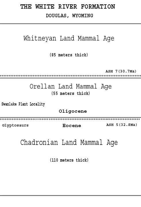 The White River Formation contains numerous late Eocene and Oligocene vertebrate, invertebrate and plant fossils in the Douglas, Wyoming area. It is composed of terrestrial sedimentary rocks (300 meters thick), including mudstones, siltstones, sandstones, minor conglomerates, and volcanic tuffs.The paleoenvironment was an aggradational meandering river system (ancestoral North Platte River) with the conglomerates and sandstones reflecting the stream channels and mudstones and siltstones deposited during periodic overbank flooding by the river.